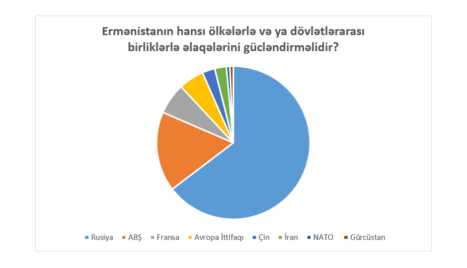 Ermənistanın Gallup ofisi Ermənistanın hansı ölkələrlə və ya dövlətlərarası birliklərlə əlaqələrini gücləndirməsi lazım olduğu soruşduqda, respondentlər belə cavab veriblər: