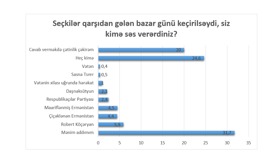 Serj Sarqsyanın rəhbərlik etdiyi Ermənistanın Respublika Partiyasının analoji reytinqi 2,4% təşkil edir. Respondentlərin 2,1%-i “Daşnaksütyun” partiyasına səs verməyə hazırdır. Rəyi soruşulanların 24,6%-ı qarşıdakı seçkilərdə heç kimə səs vermək istəmir. Digər 20% respondent isə cavab verməkdə çətinlik çəkdiyini bildirib.