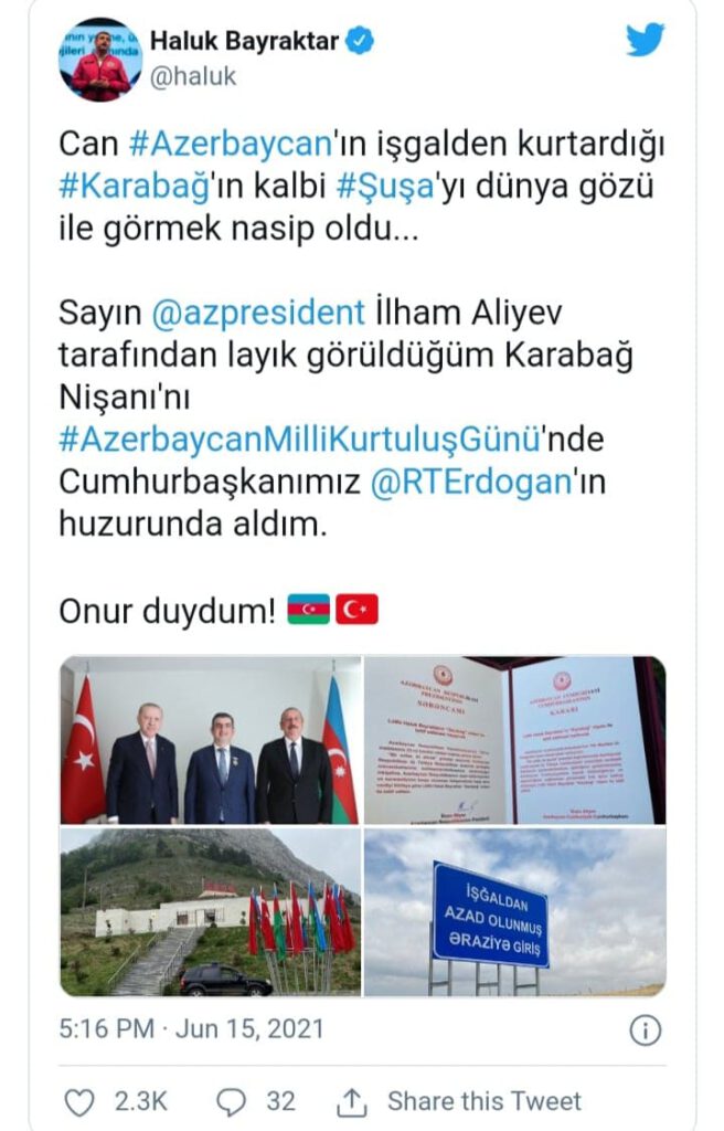 Hokm.az xəbər verir ki, bu barədə H.Bayraktar özünün “Twitter” səhifəsində məlumat verib.