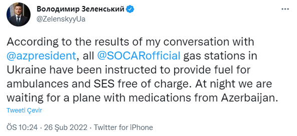 “Azərbaycan Prezidenti İlham Əliyevlə danışığımızın nəticəsi olaraq, SOCAR-ın Ukraynadakı yanacaqdoldurma məntəqələrinə təcili tibbi yardım maşınları və yanğınsöndürən maşınları pulsuz yanacaqla təmin etmək tapşırılıb”.