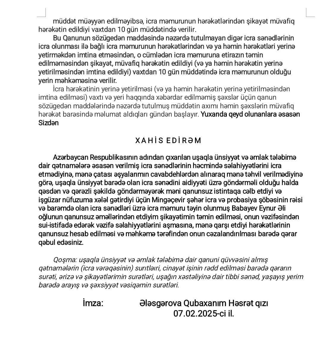 “Xəstə övladım var. Mənim bütün mübarizəm onun haqqı və gələcəyi üçündür. Mənim həbsimlə deyil, qanunun aliliyi ilə məşğul olunmalıdır. Mən cinayətkar deyiləm. Mən yalnız övladımın hüquqlarını və qanunu müdafiə edirəm.”