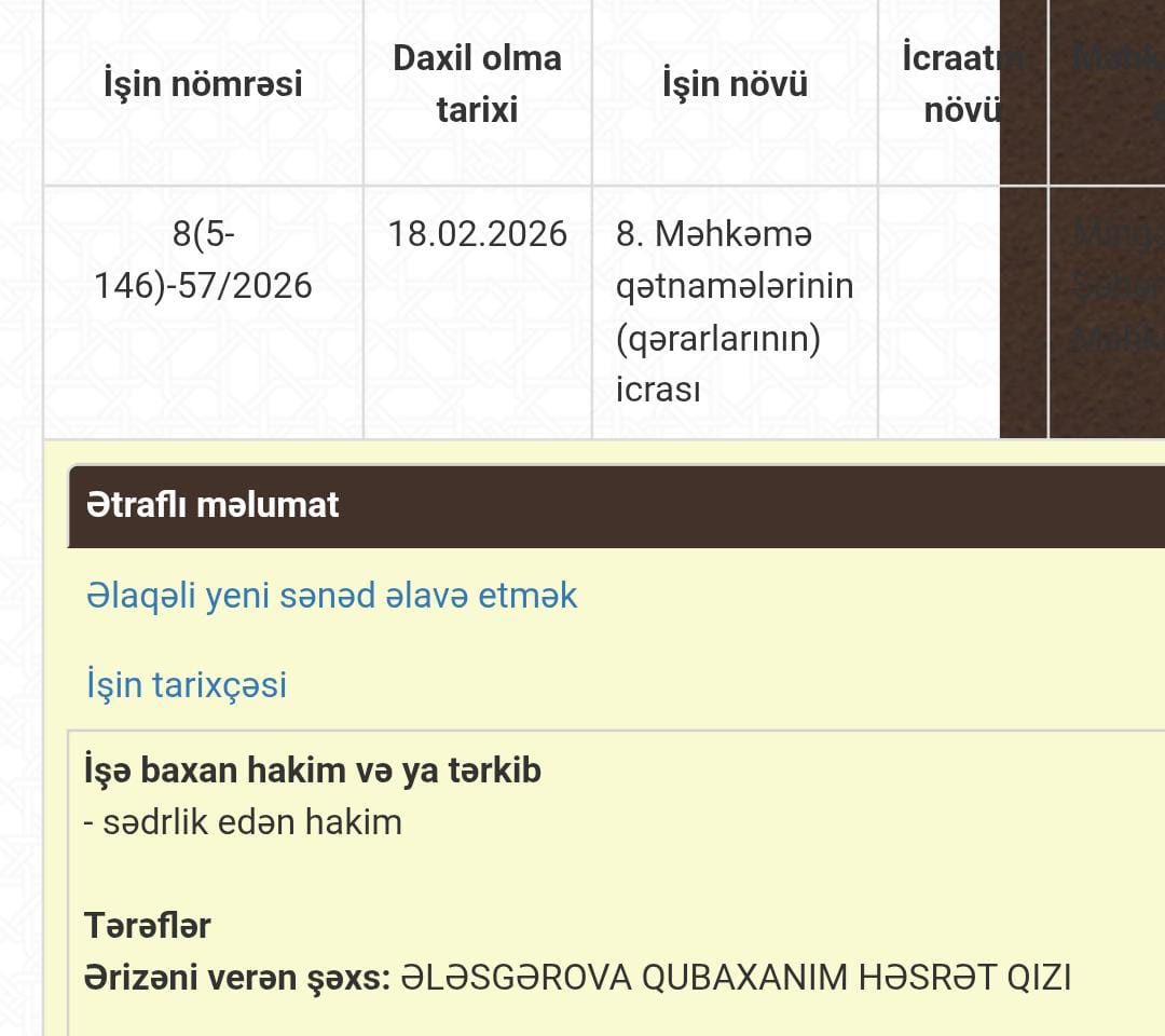 Şikayətçi bildirir ki, 17.02.2026-cı il tarixində poçt vasitəsilə məhkəməyə göndərdiyi ərizə daxil olsa da, iki gün ərzində qeydiyyata alınmayıb. 18.02.2026-cı il tarixində məhkəmə ilə əlaqə saxladıqda isə ona işlərin çoxluğu səbəbindən gözləməli olduğu bildirilib. Halbuki qanunvericiliyə əsasən, məhkəməyə daxil olan sənədlər dərhal qeydiyyata alınmalıdır. Yalnız 887 qaynar xətti vasitəsilə Hüquq Şurasına şikayət etdikdən sonra ərizənin qeydiyyata alındığı vurğulanır. Bu hal işə qeyri-obyektiv münasibət göstərilməsi ehtimalı ilə bağlı narahatlıq yaradıb.